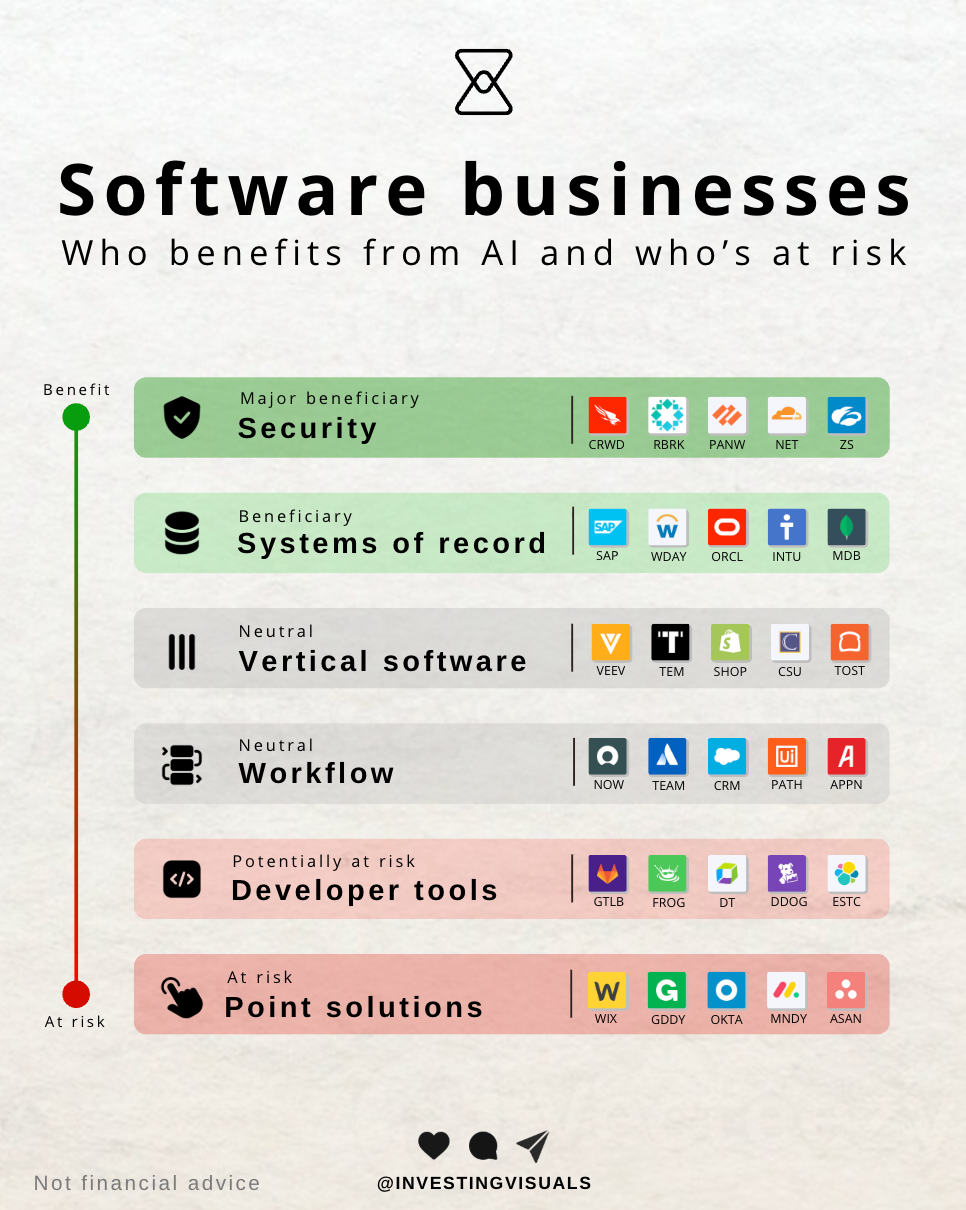 Here is how I segment it when looking at the main categories, ranking them from those who actually benefit from AI to those most at risk. With “risk” meaning that AI makes the product easier to bypass, weakens pricing power and increases churn over time.