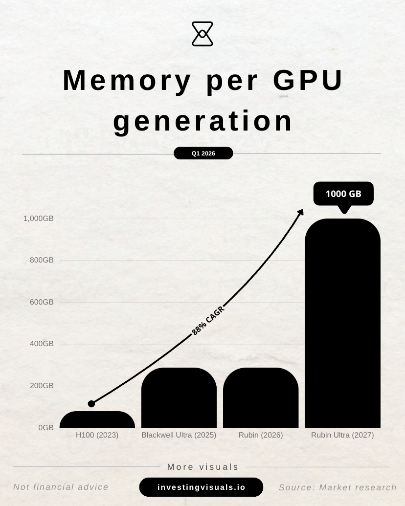 From H100 to Rubin Ultra in four years, HBM capacity per chip goes up roughly 12x. Every time Nvidia ships another rack of GPUs, the memory inside that rack is meaningfully larger than the last one.