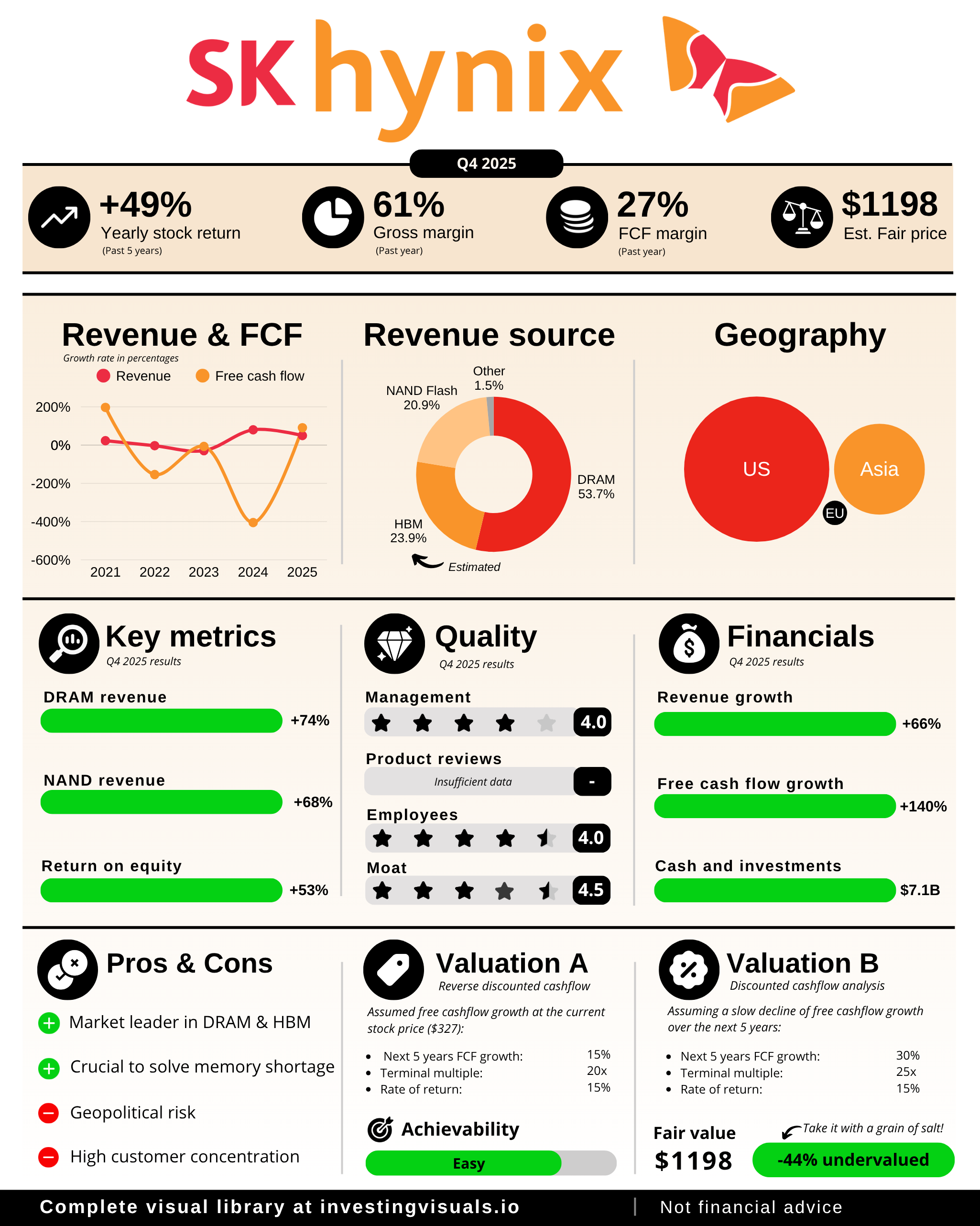 HBM revenue more than doubled year over year in 2025. Q4 2025 gross margin reached 69%, surpassing TSMC's 62% for the same quarter. That's a massive achievement. TSMC is the most respected semiconductor foundry in the world and consistently trades at premium multiples reflecting its structural moat. And SK Hynix posted a higher margin.
