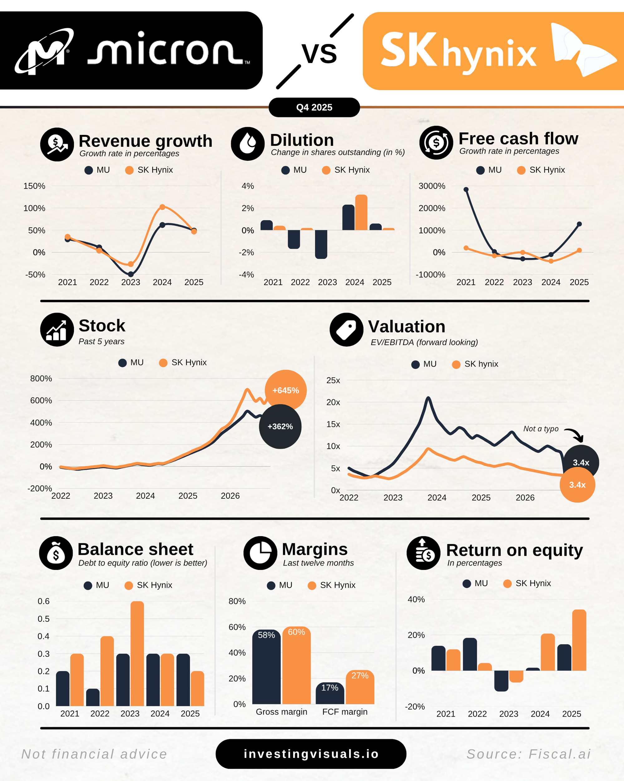 For context, both SK Hynix and Micron trade at a 40% discount on an EV/EBITDA basis compared to TSMC. That's not an apples to apples comparison, but it shows they aren't trading at lofty valuations either. Their stock prices simply followed a major uptick in revenue, margins, and net income.