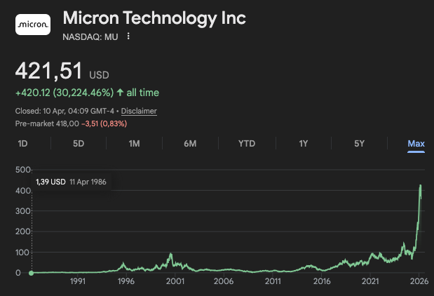 The mechanism of reversal shares familiar characteristics: supply inertia means all three producers commit capex based on current demand signals and build simultaneously. New capacity arrives into a market where demand has either moderated or been met, and prices collapse under fixed cost leverage. That pattern is clearly visible in Micron's stock price over the past decades. And it's clear as day that we're in the boom phase right now.