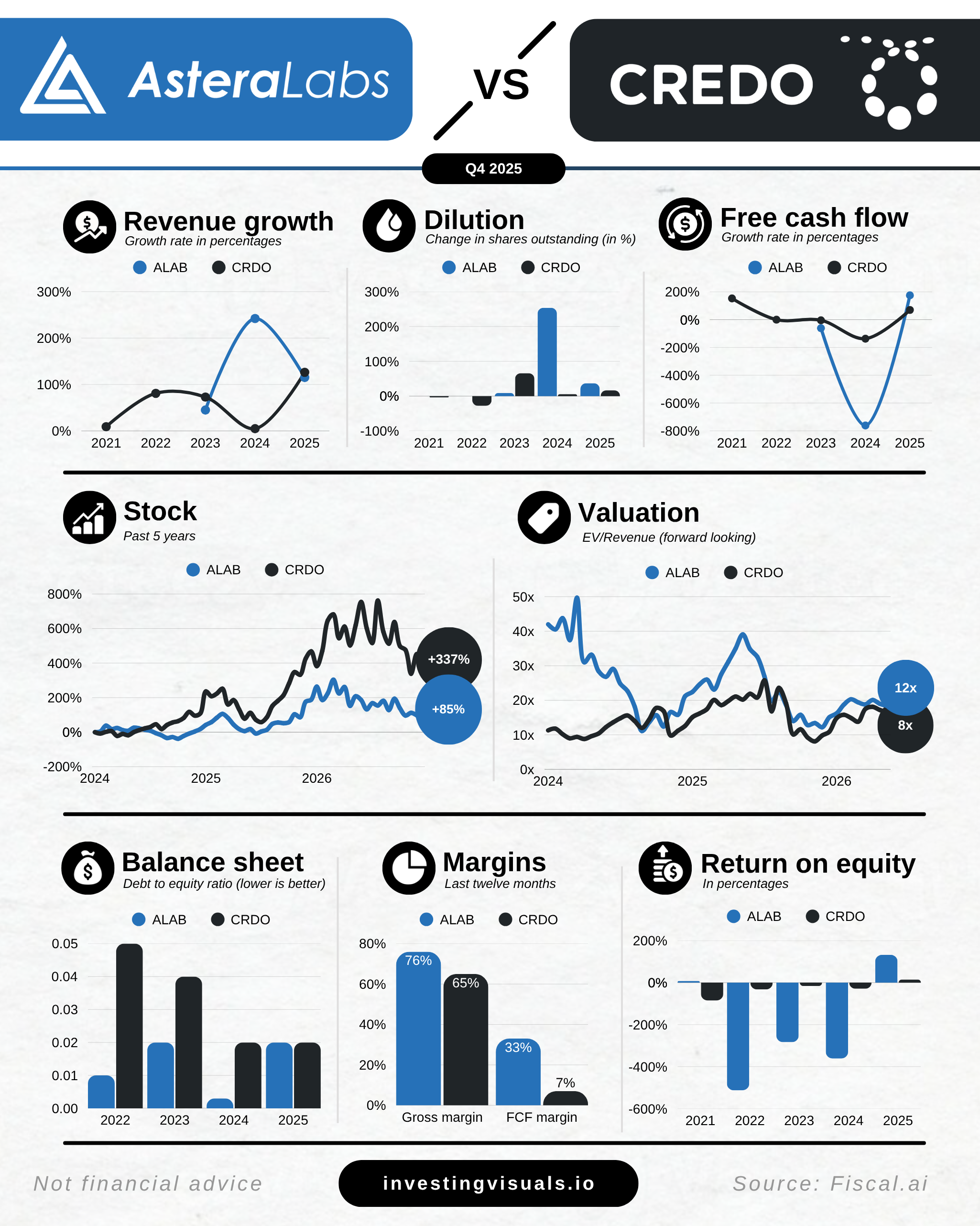 Astera Labs designs connectivity solutions (data, network, and memory) for cloud and AI infrastructure, founded in 2017 with ~440 employees. Credo Technology focuses on high-speed electrical and optical Ethernet connectivity using SerDes and DSP technologies, founded in 2008 with ~500 employees.