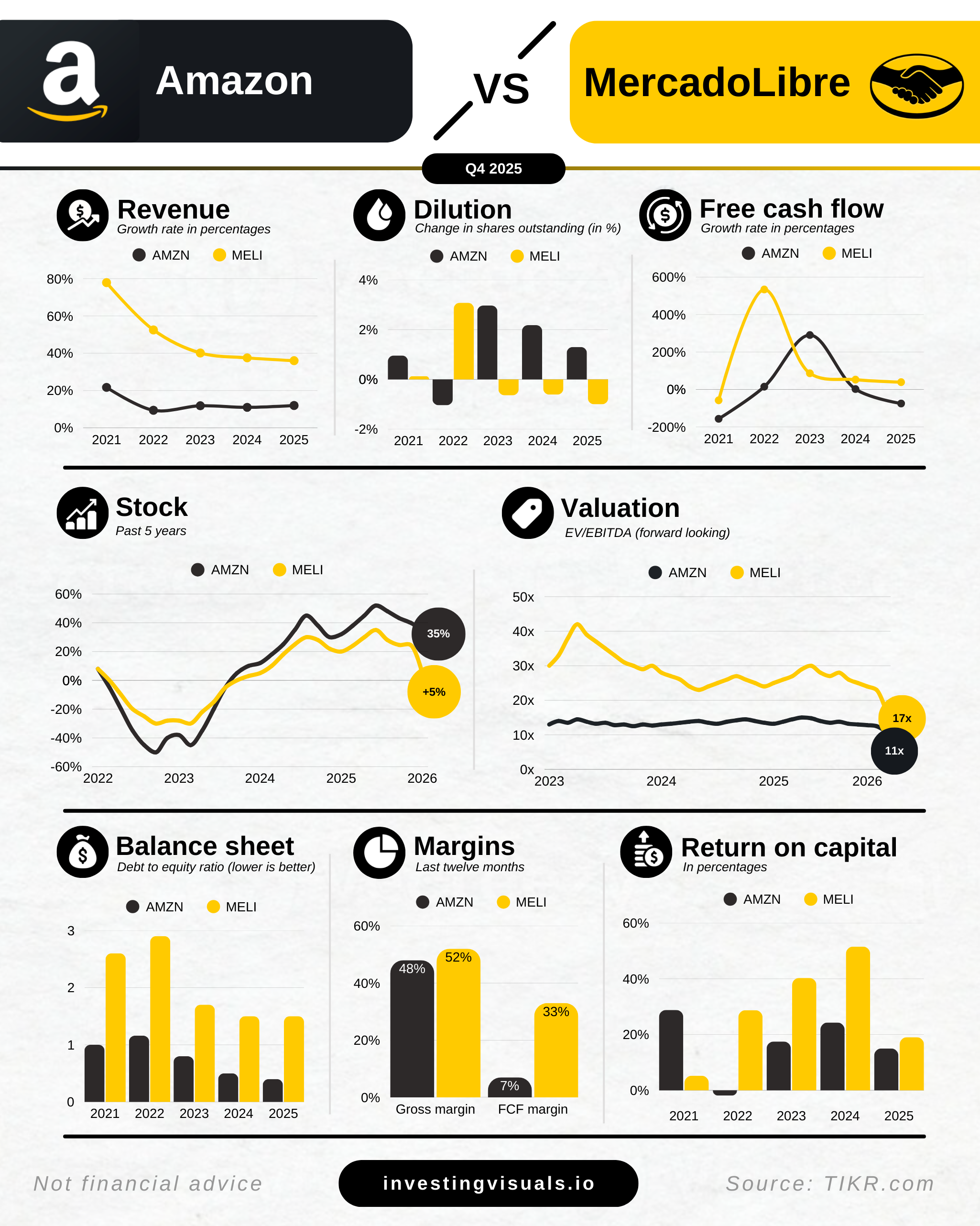 Mar 16, 2026 1 min read Investing visuals Business Battles Amazon vs MercadoLibre Sign-up And receive the latest visuals and articles straight to your inbox Subscribe Email sent. Check your inbox! Jan (Investing Visuals) — Passionate designer, writer and investor. View all posts