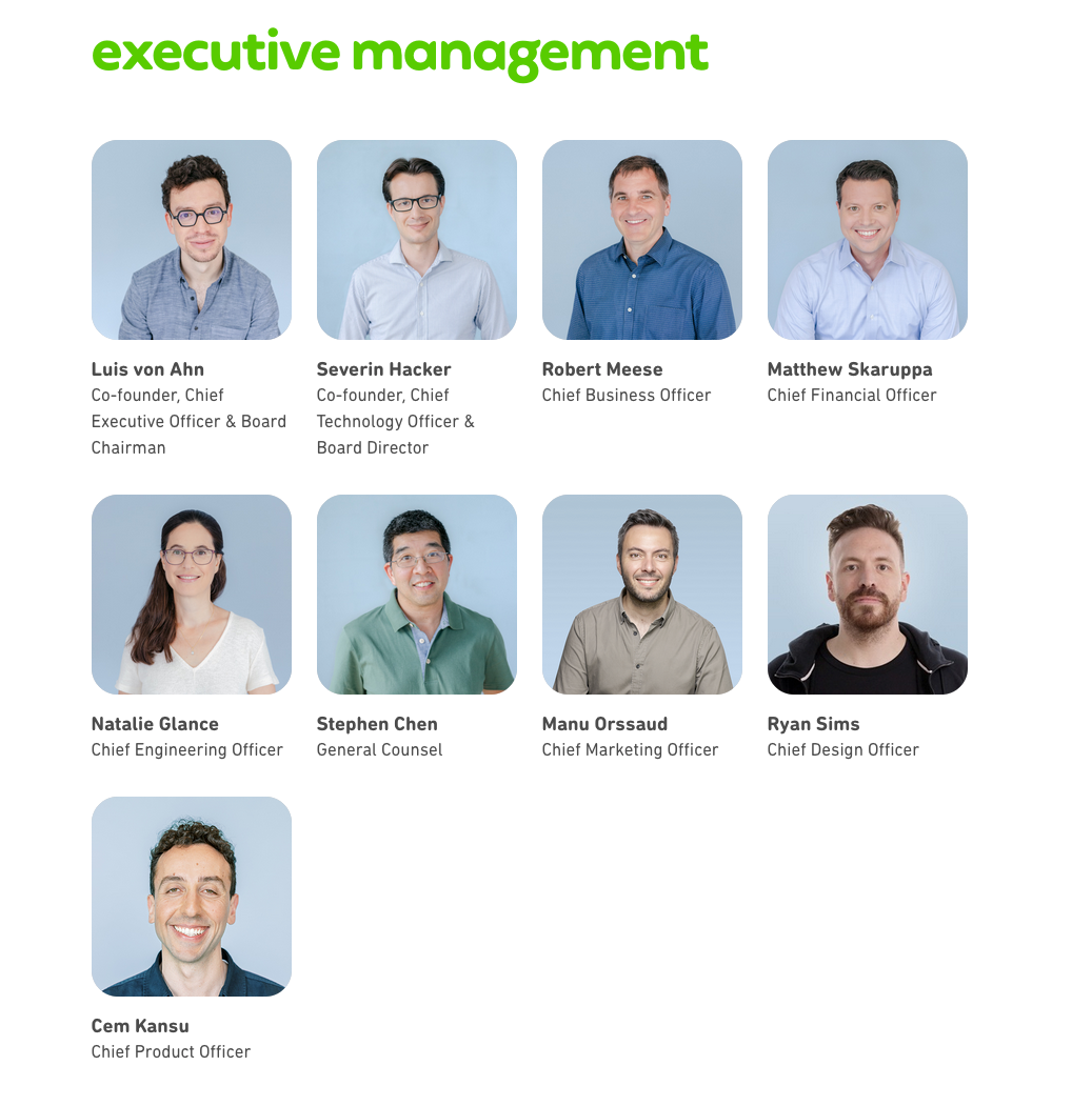 Luis von Ahn is the co-founder, CEO and board chair. Before Duolingo, he created reCAPTCHA, which was acquired by Google. Severin Hacker (awsome surname by the way) is the technical cofounder and CTO. He is still deeply involved in the engineering side of the business, and that continuity matters because Duolingo’s advantage is not marketing. It is product iteration at scale.