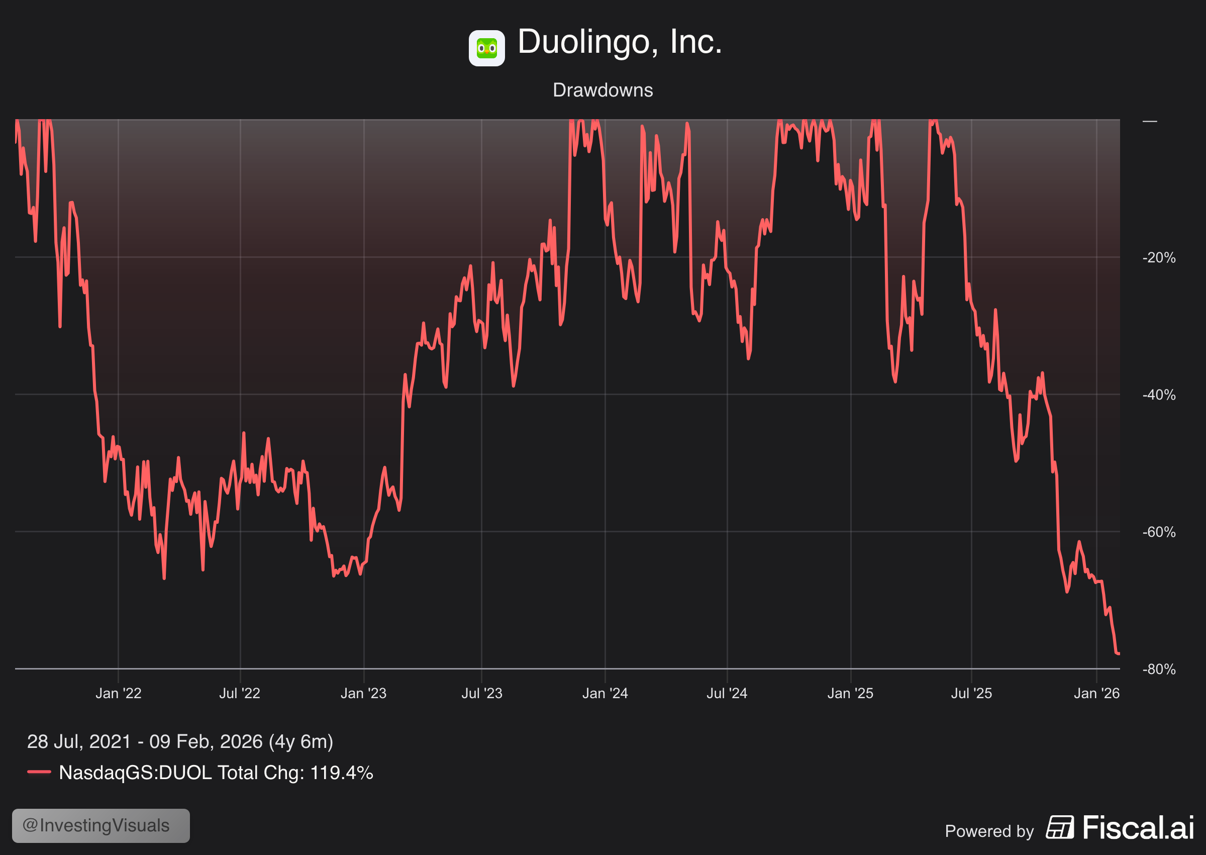 In may 2025 Duolingo's stock traded at $540. At the time of writing this deep dive, it trades at $120. That is a drawdown of about 75%, and the largest since going public.