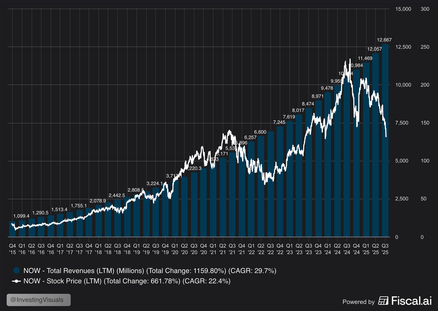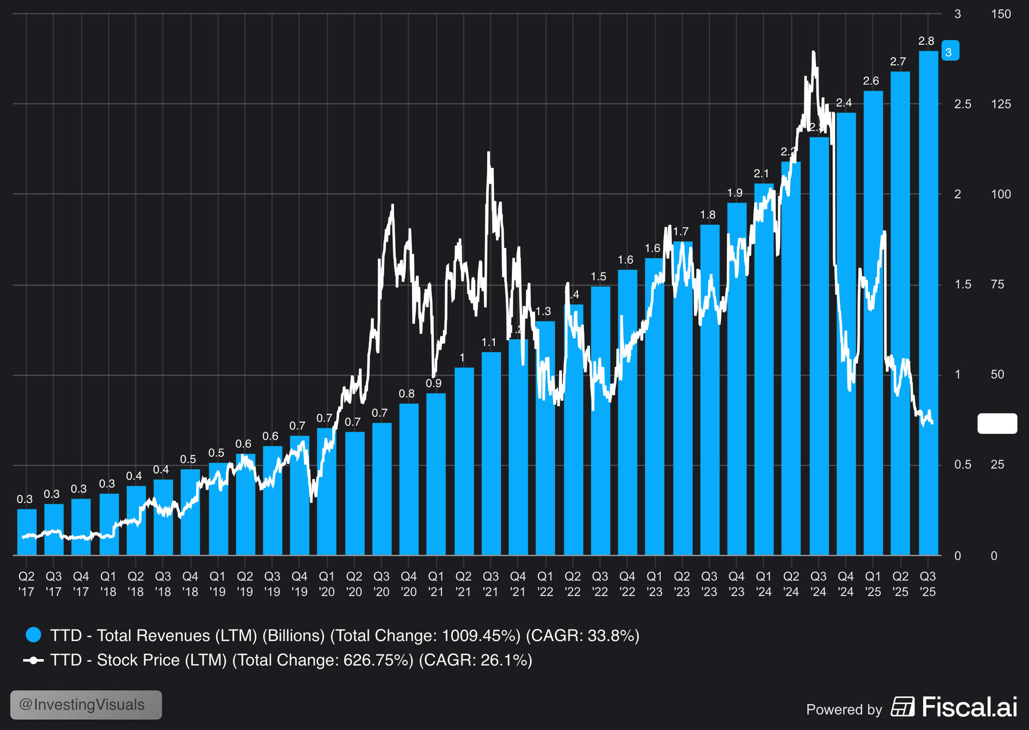 It is also the worst performing stock of the S&P 500 in 2025, down a staggering -68%. So what happened here? Because it looks like a business performing very well based on the chart below with a clear disconnect between stock price and revenue growth.