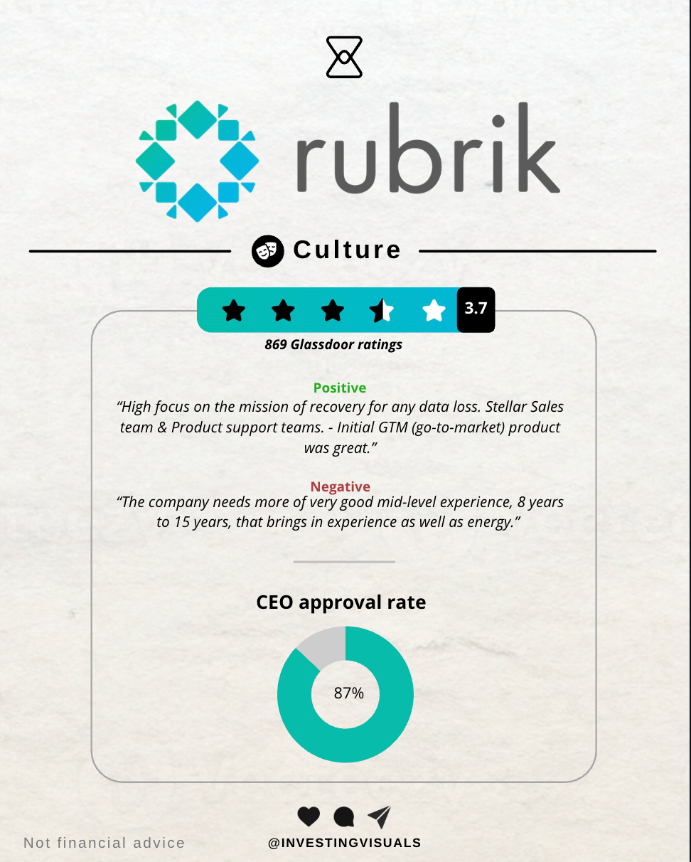 Rubrik is founder‑led so the departure of Bipul Sinha and/or CTO Arvind Nithrakashyap could impact innovation and culture. Especially given the fact that Sinha gets an 87% approval rate from employees, which is hard to replace.