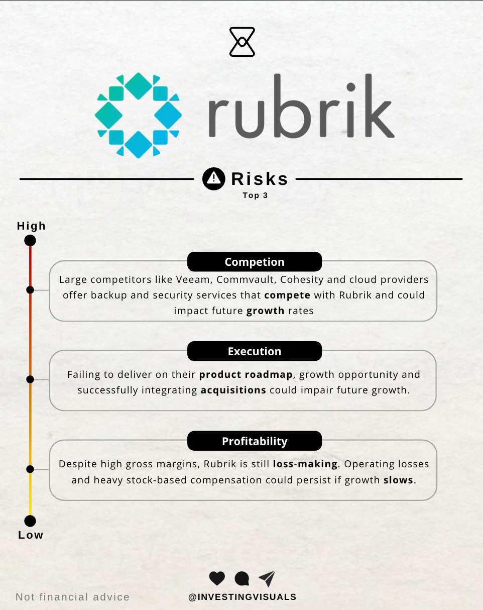 Despite high gross margins, Rubrik is still loss‑making. Operating losses and heavy stock‑based compensation could persist if growth slows. Free cash flow recently turned positive but it’s dependent on upfront billings; a slowdown in new bookings could lead to cash burn.