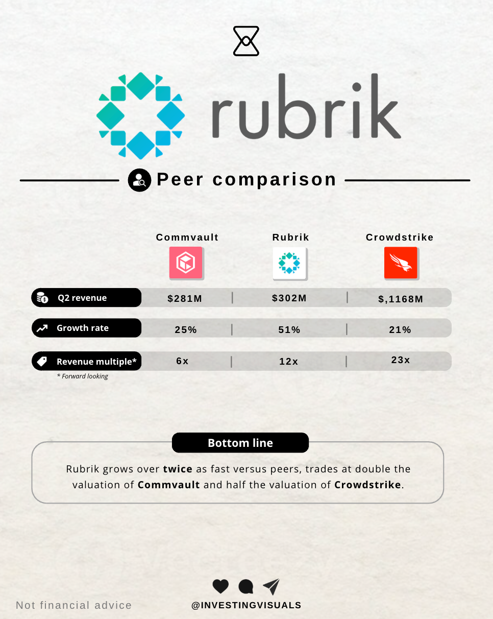 Rubrik grows over twice as fast versus peers, trades at double the valuation of Commvault and half the valuation of Crowdstrike.
