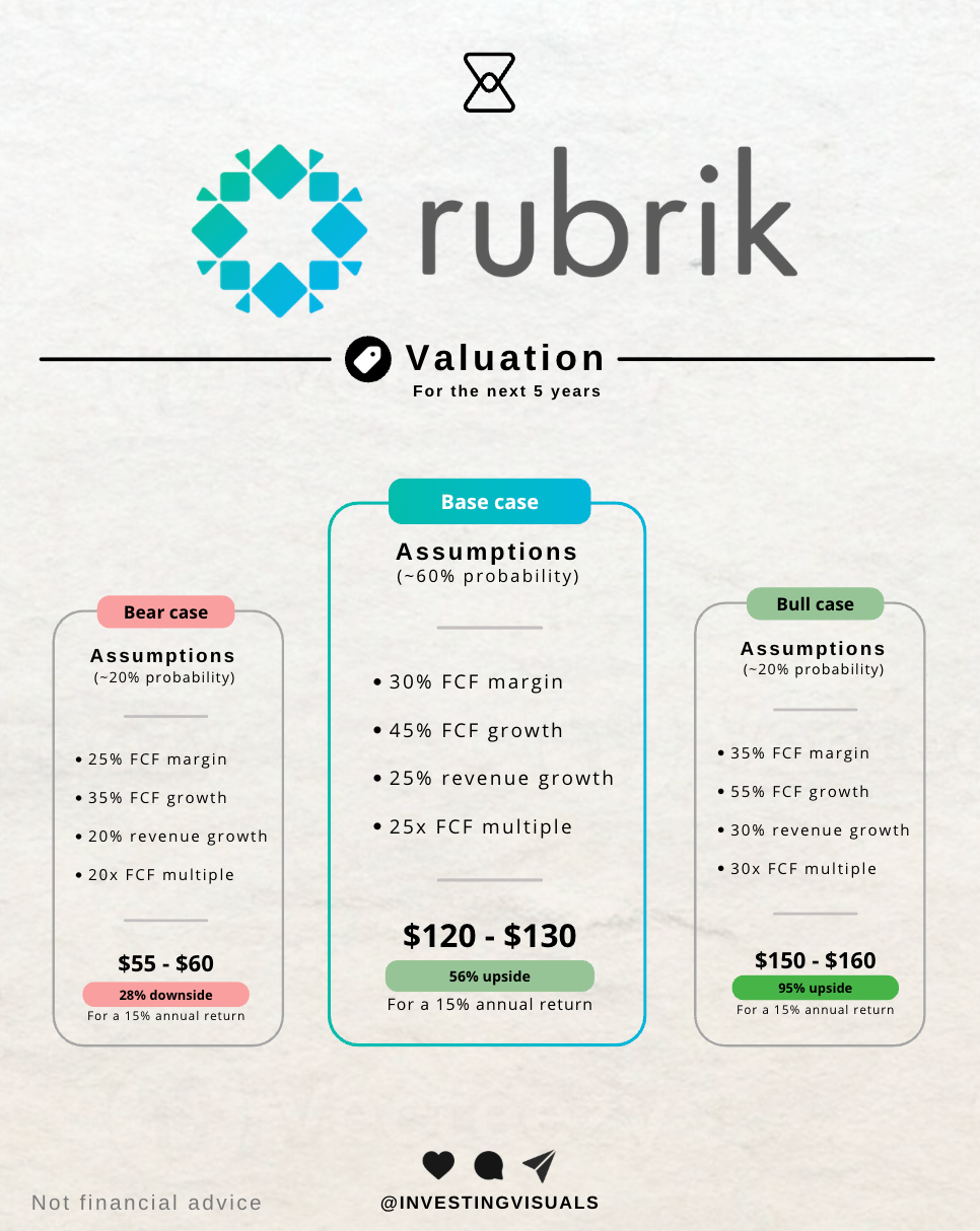 It’s especially challenging for Rubrik because they just turned free cash flow positive. It’s still a good exercise to think in scenarios though. Below are the bear, base and bull cases along with the assumptions for a 5-year time horizon.