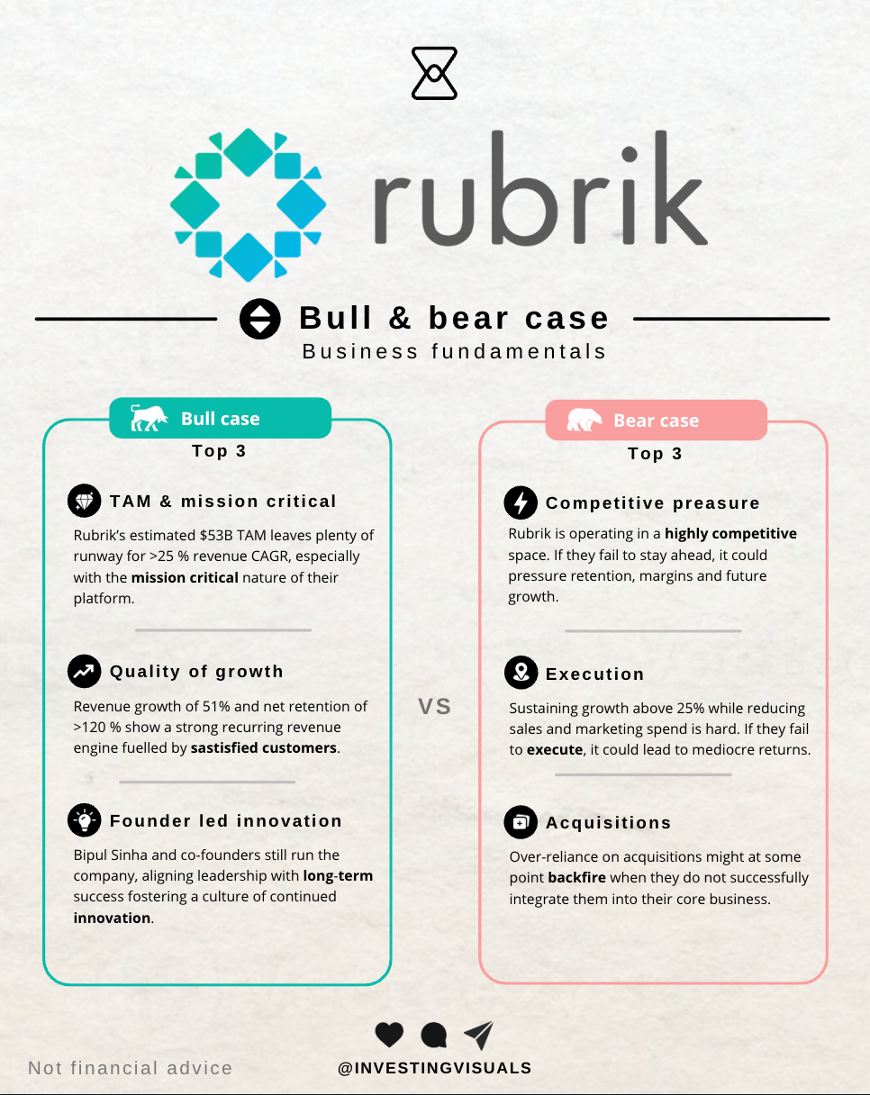 - Acquisitions: So far, Rubrik did some great tuck-in acquisitions, but overreliance on acquisitions might at some point backfire when they do not successfully integrate them into their core business. It can lead to permanent destruction of capital and a lot of time and effort wasted.