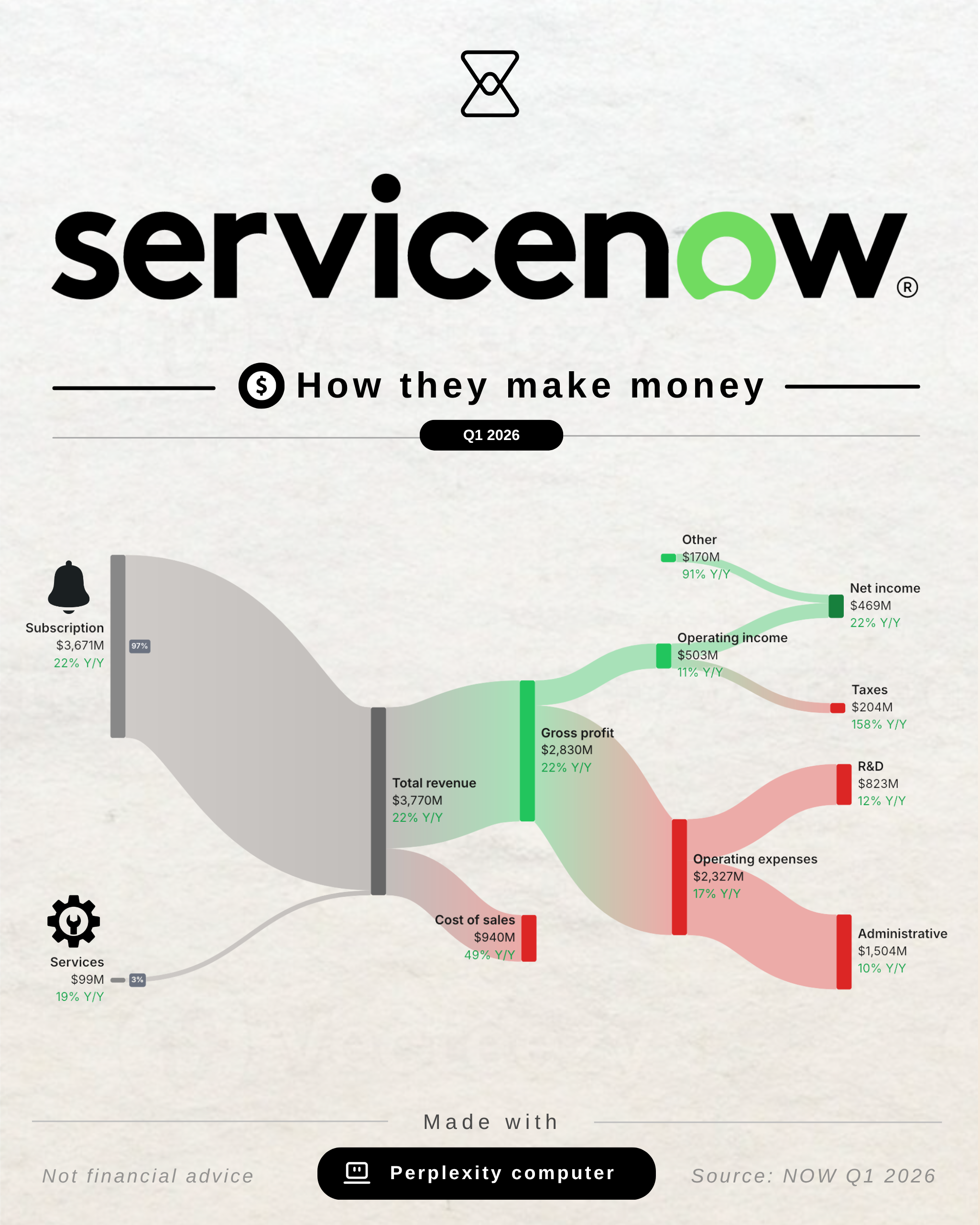 ServiceNow is an enterprise software platform that automates and orchestrates workflows across IT, HR, security, customer service, and increasingly, AI agents. Think of it as the operating system for how large companies get things done internally. They make money primarily through subscription contracts, and the stickiness of the platform is exceptional: once a company builds its core processes on ServiceNow, ripping it out is very hard.